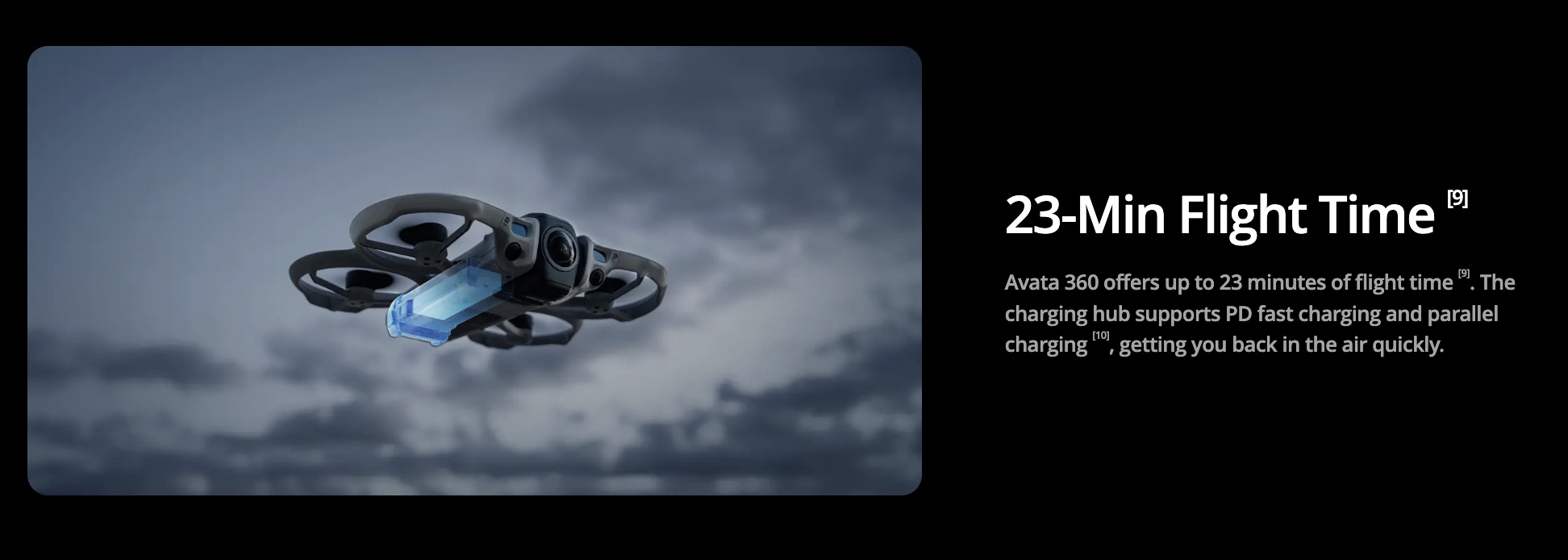 Charging Time With Charging Hub (100W max charging power): One Battery, From 0 to 100%: Approx. 47 min, One Battery, From 10 to 90%: Approx. 31 min, Three Batteries, From 0 to 100%: Approx. 100 min, Three Batteries, From 10 to 90%: Approx. 70 min. Directly Charging the Drone (65W max charging power):‌ One Battery, From 0 to 100%: Approx. 73 min, One Battery, From 10 to 90%: Approx. 51 min. Data tested under laboratory conditions at 25° C (77° F) and can be used for reference only. Actual charging time may increase due to higher ambient temperatures or variations in mains voltage between regions.