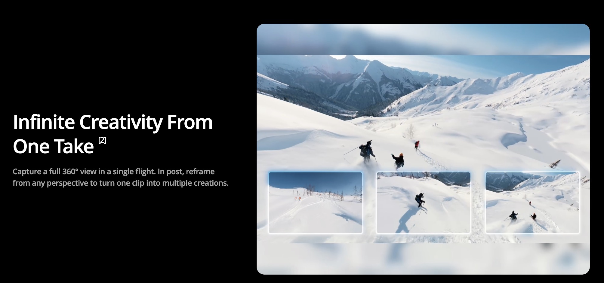 Capture a full 360° view in a single flight. In post, reframe from any perspective to turn one clip into multiple creations.