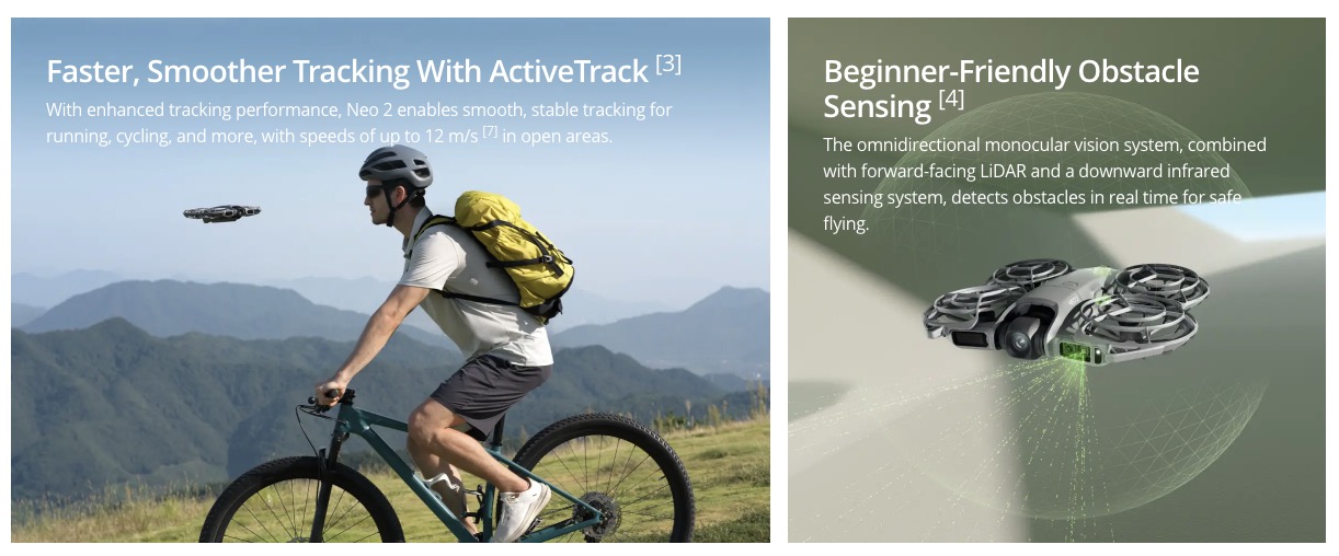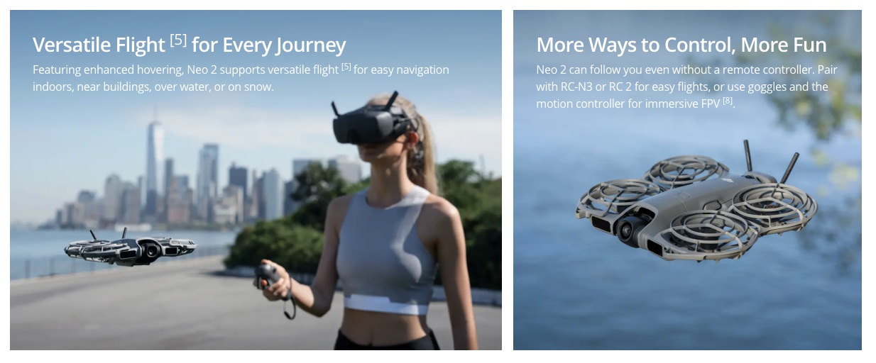 | Max Hovering Time | Approx. 18 minutes (16.5 minutes with the propeller guards), Measured when hovering in a windless environment 20 m above sea level, without DJI Neo 2 Digital Transceiver, with camera parameters set to 1080p/30fps, video mode off, and from 100% battery level until 0%. Results may vary depending on the environment, actual use, and firmware version. |