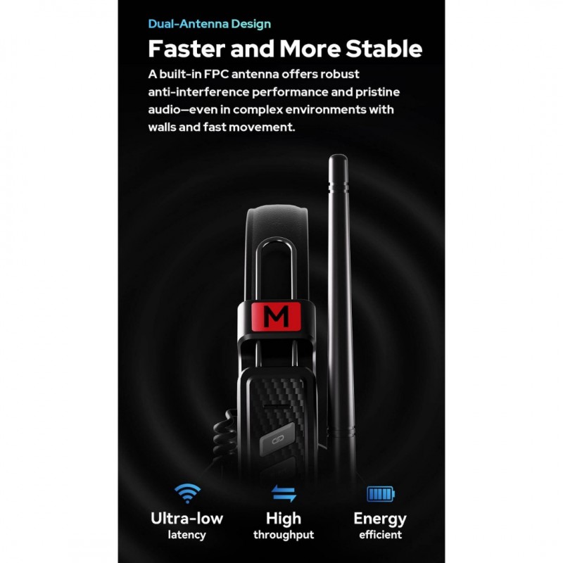 A dual-antenna design combines a built-in FPC antenna with frequency hopping technology for faster, more stable transmission. The system supports up to a 1640' transmission range with strong anti-interference performance, even in complex environments with walls or fast movement.