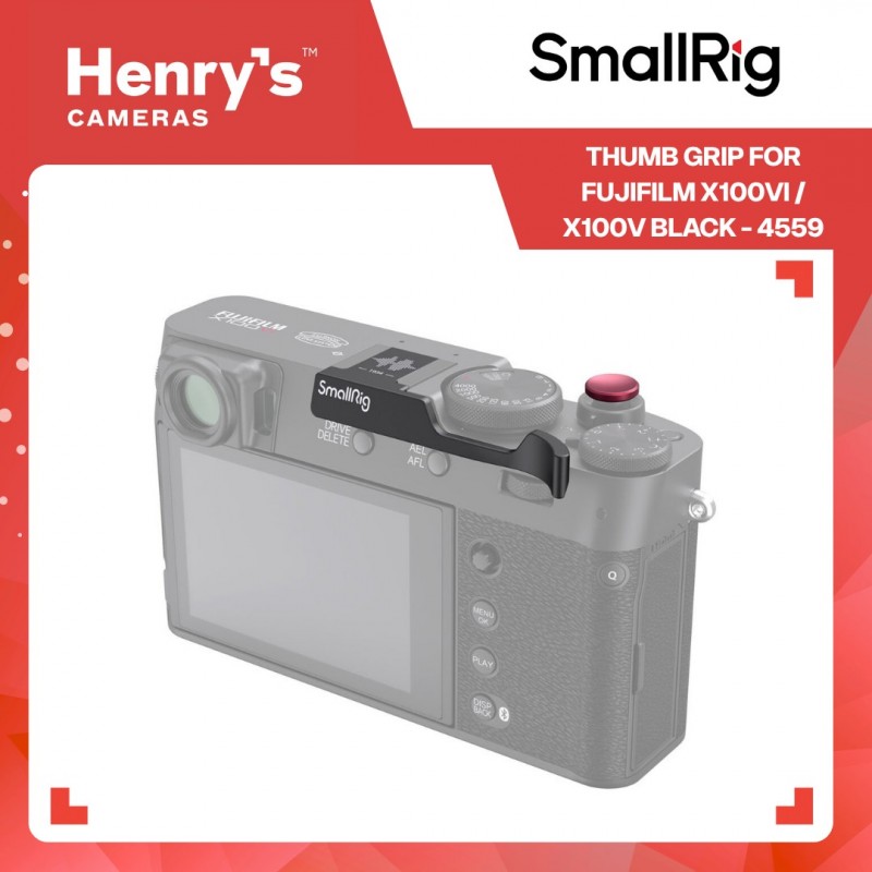 Shoot longer, and with added comfort and stability, using the SmallRig Thumb Grip for the FUJIFILM X100VI and X100V. It slides easily into the camera's hot shoe and provides a concave groove to improve safety and one-handed shooting. Engraved with the FUJIFILM sound wave and foundation year, the grip has built-in silicone pads to protect your camera body and hot shoe electronic components from dust, rust, and electronic shorts. It comes with a shutter release button to ensure a soft and comfortable finger touch.