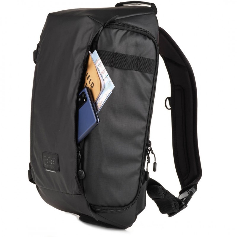 Comfortably carry your camera kit with the black Solstice V2 Sling Bag from Tenba. It has a 12L capacity to carry your DLSR or mirrorless camera with three to five lenses, including a camera and lens combo up to 15.5" in length. This bag accommodates the Tamron/Sigma 150-600mm and similar-sized lenses. There's also space for your 8" tablet or iPad mini and a DJI Mavic or other compact drone. Quickly and easily grab your camera via the side access door. The reinforced side pocket holds a small to medium size tripod and the repositionable lash straps attach a jacket to the front of the pack. A hidden neoprene sleeve stores your Bluetooth or AirTag tracker so you can recover the bag if it becomes lost or stolen.