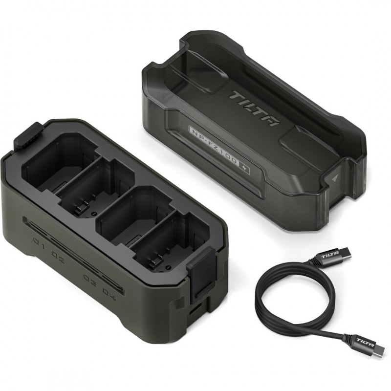 The Portable Charging Station for NP-FZ100 Batteries from Tilta features four integrated battery charging slots that support Sony and third-party NP-FZ100 batteries. The charger is powered using a USB-C PD input that provides fast 45W power input to simultaneously charge four batteries quickly, while real time status indicators show you the charging progress of each bay. The charger is lightweight and highly portable, making it easy to take with you on the go.