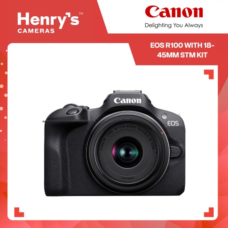 Canon EOS R100 Mirrorless Camera, Canon LP-E17 Lithium-Ion Battery Pack, Canon LC-E17 Charger for LP-E17 Battery Pack, Neck Strap, Canon RF-S 18-45mm f/4.5-6.3 IS STM Lens |